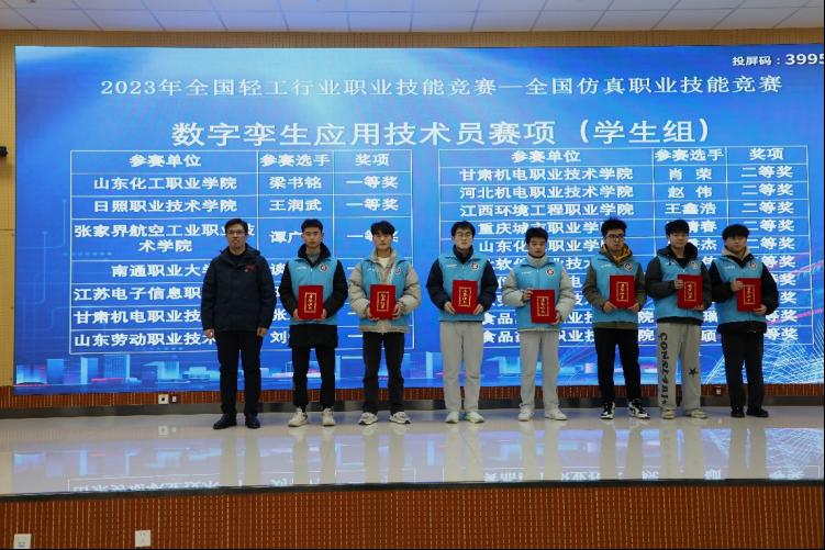 2024年1月18日至20日,由中国轻工联合会、中国工业合作协会主办的2023年全国轻工行业职业技能竞赛—全国仿真职业技能竞赛在山东轻工业职业技术学院举行。甘肃机电职业技术学院电气工程学院4名参赛师生奋力拼搏,斩获佳绩。在数字孪生应用赛项(单人赛)中,我校教师赵明杰、贾文鹏分别荣获职工组特等奖、一等奖;张正红、肖荣分别荣获学生组一等奖、二等奖;学校荣获“优秀组织奖”。