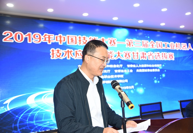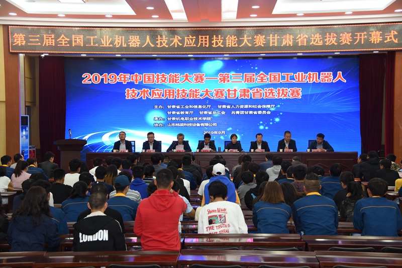 第三届全国工业机器人技术应用技能大赛甘肃省选拔赛于9月18日在我院举行。省委教育工委委员、省教育厅党组成员、副厅长时宁国,省总工会副主席张爱华,省人社厅职业技能鉴定指导中心主任何元魁,省工业和信息化厅装备工业处副处长陈清,团省委青年发展与权益维护部副部长吴镇涛,天水市工信委党组书记、主任何晓斌,山东栋梁科技设备有限公司北方区总监郭刚,学院领导坚葆林、赵彦军、李自勇、张德龙、毛文辉出席开幕式,全体参赛选手、裁判员、指导教师,学院有关部门负责人参加。