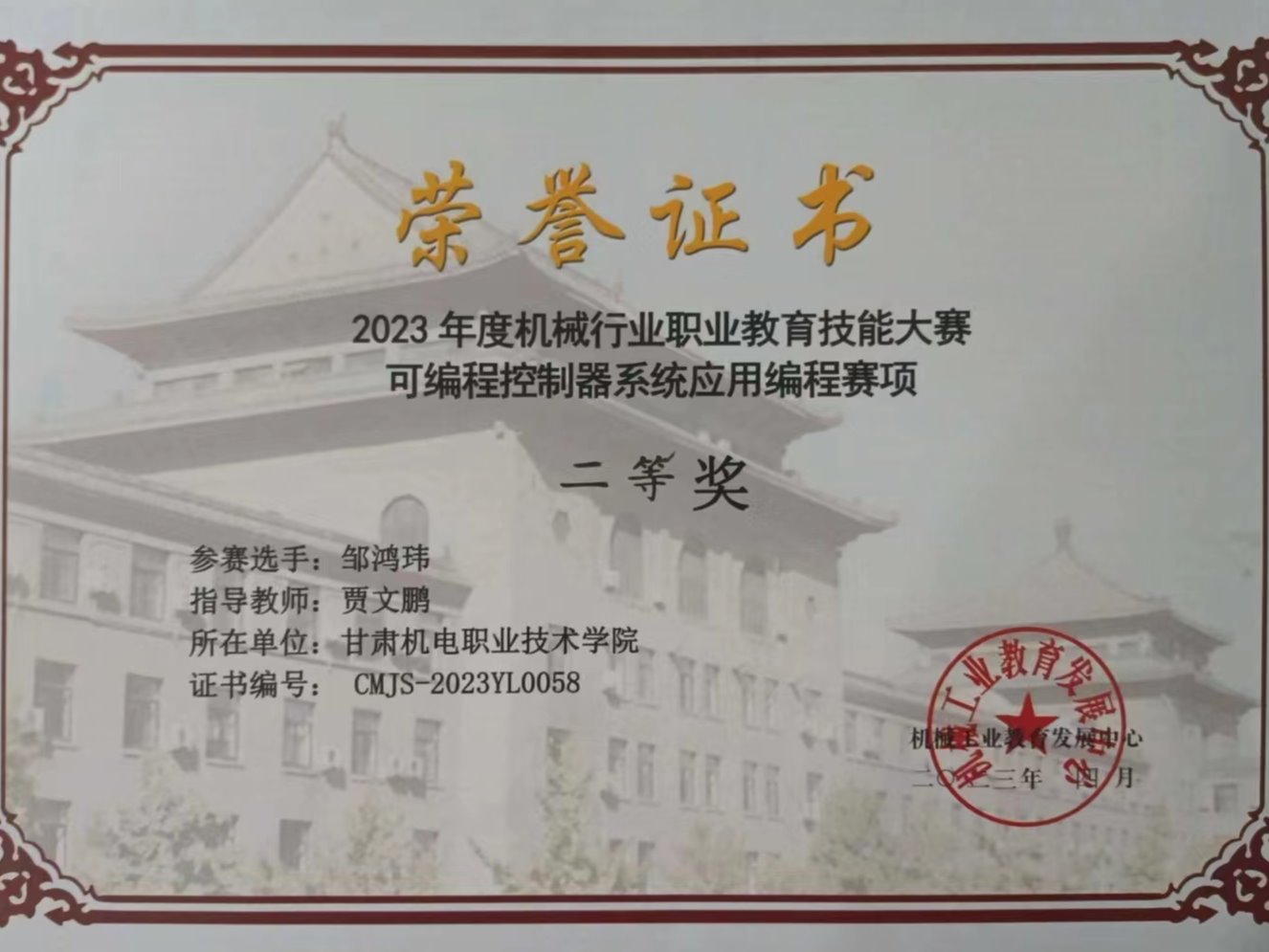 近日,2023年度机械行业职业教育技能大赛“可编程控制器系统应用编程”赛项公布比赛结果,电气工程学院选送的2020级学生邹鸿玮,在该赛项中荣获高职组(含职教本科)二等奖。除了相应的奖项荣誉,获奖选手将予以颁发“可编程控制器系统应用编程职业技能等级证书(中级)/(初级)