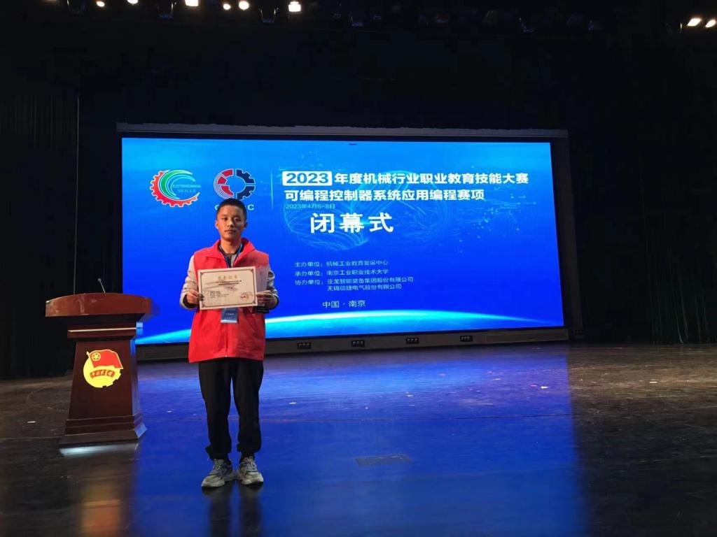 2023年是该赛项首次举办,共吸引了来自全国的150支队伍同台竞技,规模空前。邹鸿玮同学在完成通信系统连接、通信参数配置、传感器调试、PLC编程、视觉系统编程调试等任务的同时,充分展现了系统运维优化等工程实践能力和良好的职业素养,最终在150余支代表队中脱颖而出,获得高职组二等奖,这是电气工程学院继2022年全国职业院校技能大赛获奖后取得的最新成果。