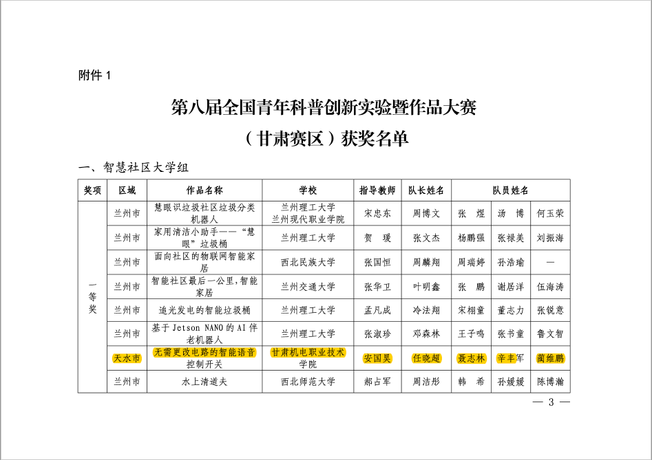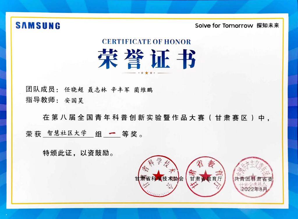 2022年8月17日,由甘肃省科学技术协会、甘肃省教育厅、共青团甘肃省委联合主办的第八届全国青年科普创新实验暨作品大赛(甘肃赛区)传来表彰喜讯,电气工程学院安国昊老师指导,任晓超、聂志林、辛丰军、蔺维鹏等四名学生参赛的“无需更改电路的智能语音控制开关”项目,在“甘肃赛区”与省内众多本科院校同台竞技,荣获一等奖。