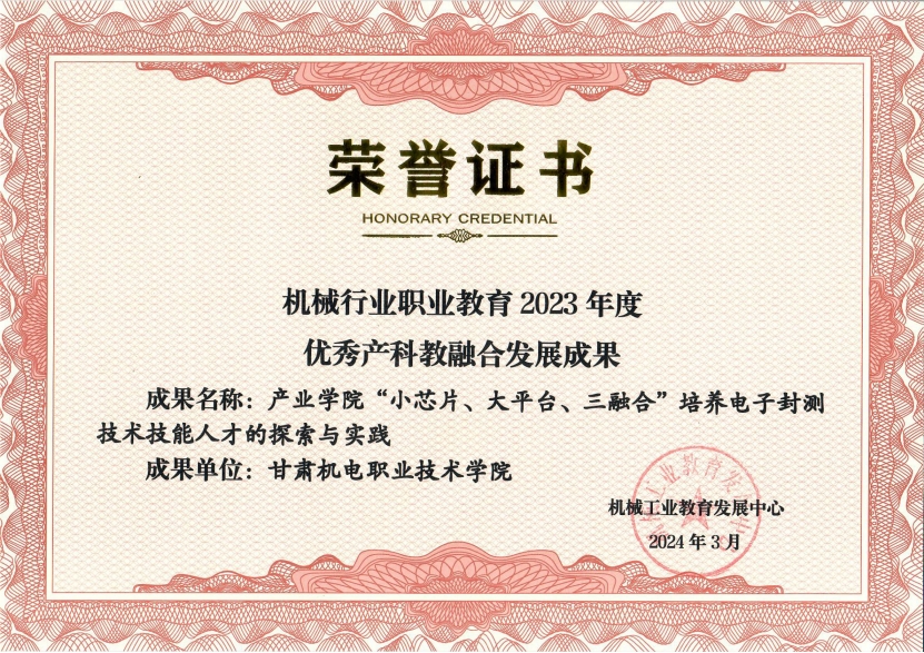 近期,机械工业教育发展中心公布了全国机械行业职业教育2023年度产科教融合发展成果和产学研合作项目评选结果,电气工程学院的《产业学院“小芯片、大平台、三融合”培养电子封测技术技能人才的探索与实践》获评“机械行业职业教育2023年度优秀产科教融合发展成果”。
